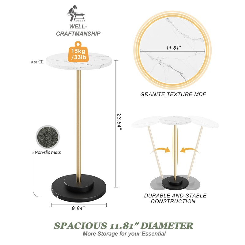 - Sturdy Structure: This round side table, crafted from high-density MDF and finished with a water-resistant coating. The base of this small drink table has a relatively large area and a thickened double-layer design, which ensures the stability of this side table and prevents it from sliding or tilting