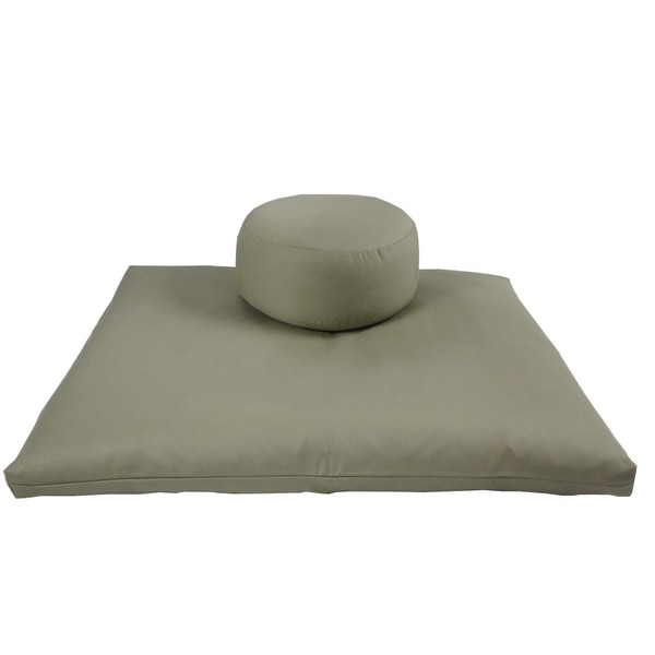 Our Round Zafu and Zabuton Set (2Pc) includes one round zafu cushion and one zabuton mat. You can save money by ordering two products together. Our round zafu is a version of the round traditional meditation cushion without pleated sides. Without pleats the round zafu will hold its height and won't spread out. The zafu is stuffed with buckwheat hulls. All our zafus are double-stitched for extra strength and come with a carrying handle. The zabuton is filled with natural kapok. The kapok is packed to provide solid support, and yet is soft and comfort. The outer cover is made of durable cottton twill fabric and has a zipper along one length so that it can be easily removed and washed. Inside the cover, the kapok is enclosed in a casing. Each zabuton is approximately 30" long by 28" wide and may fits people up to 5' 10" tall.