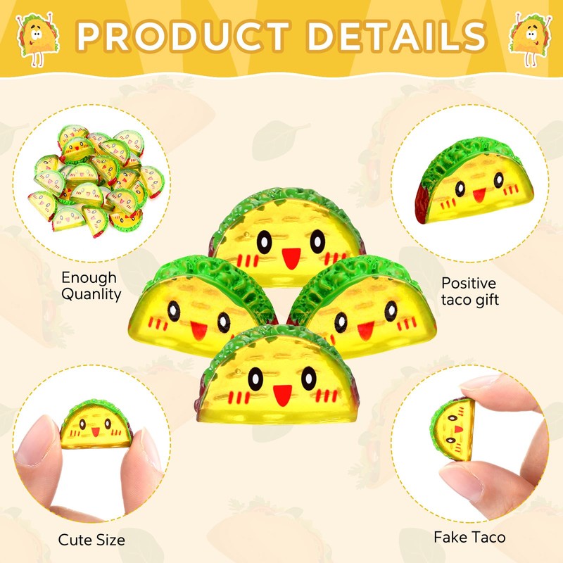 - Accurately Sized: the taco gifts in this package are designed to be the ideal size, easy to handle and realistic to appreciate 1.18 x 0.39 inches/ 3 x 1 cm, Every taco comes with a card of size 3.31 x 1.85 inches/ 8.4 x 4.7 cm and a pretty organza bag of size 3.94 x 4.72 inches/ 10 x 12 cm; Designed to spread love and bring smiles, they are truly a motivational gift
