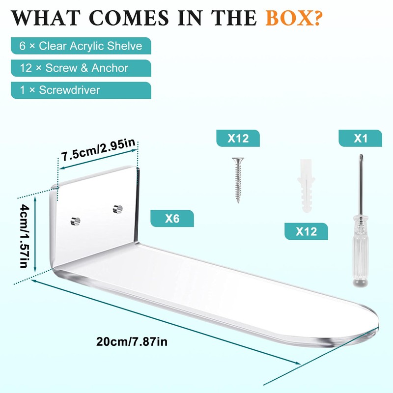 - [QUALITY GUARANTEE]: The thick 1/4 acrylic wall shelf is and can easily carry 6 pounds of things. We are very convinced of the quality of our products.