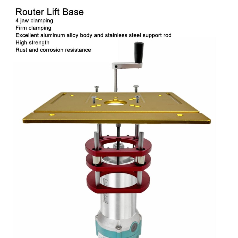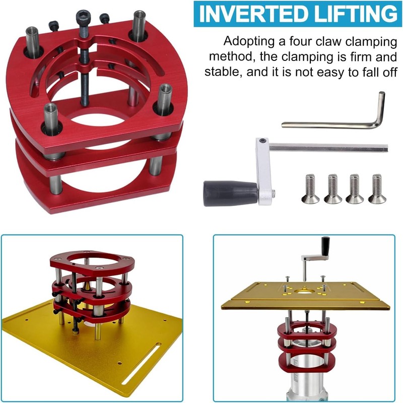 Features: 4 jaw clamps, strong hold, practical. Easy to use, quick installation, lifting handle use: suitable for creating your own router work table for precision wood processing. List of packages: 1 x router lifting base.