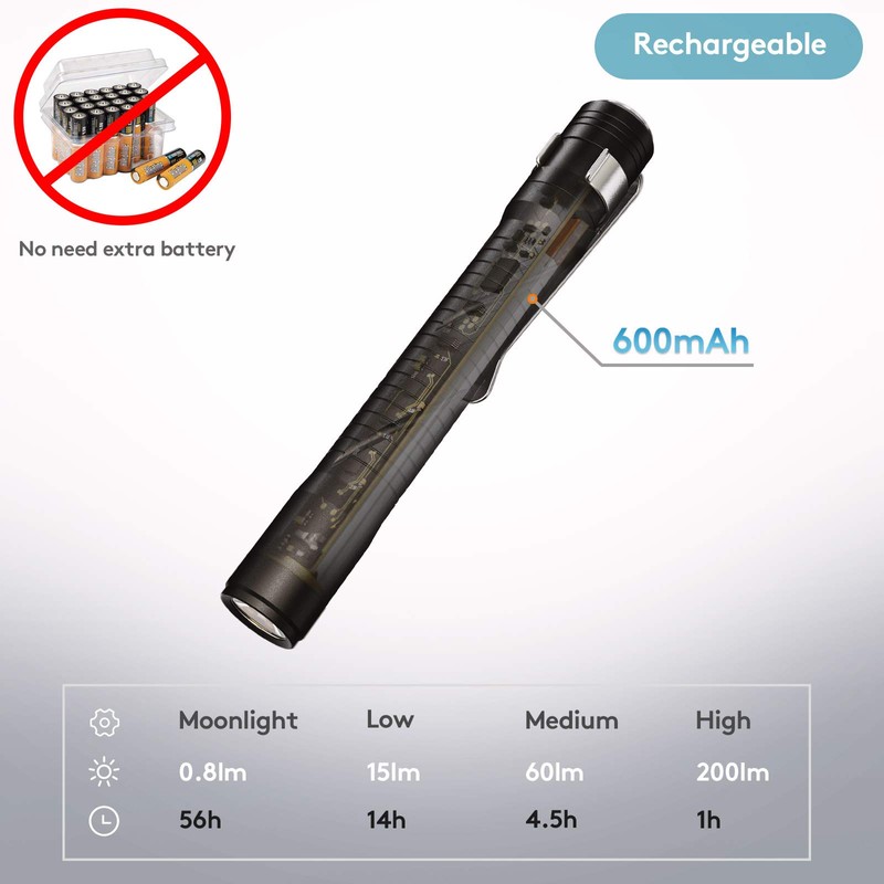 - A New Breakthrough: XP-G2 LED produces 200 lumens, unlike other pen light on the market, this A33 led flashlight doesn’t need any batteries and will never step down. 40m beam, IPX8 waterproof, lats up to 56 hours on moonlight mode.