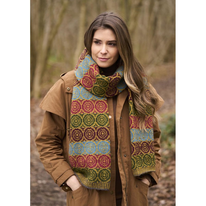 Rowan Moordale lends itself beautifully to colourwork and in this accessory collection our designers champion this with techniques such as Fair Isle, slip stitch and stripes, alongside some textured elements. The result is a captivating collection of scarves, cowls, shawls, gloves, mittens, berets and a bag, all of which are a wonderful way to try out a new technique.