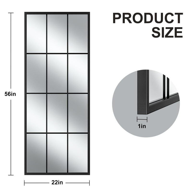 Rowjut Full Length/Floor Mirror, 65"x 22" Window Mirror, Wall Decorative Mirror, Aluminium Framed Window Pane Mirror, Square Wall Mirror for Entryway, Living Room, Bedroom, Fireplace (Black)
