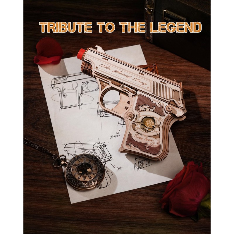 - ROWOOD Wooden 3D Puzzle: Inspired by the iconic M1906 Browning, this intricately crafted model blends nostalgia and creativity in a single, easy-to-hold, one-handed design. Whether you’re assembling, launching the rubber bands mechanism, or simply displaying it as a treasured addition to your collection, this model kit invites you into a world of diverse gameplay and display possibilities