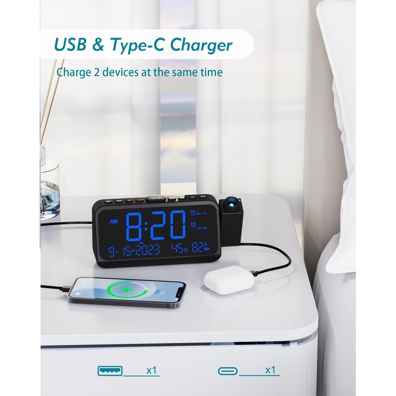 Special Feature:Adjustable Brightness, Double Bell, Projection Clock, Adjustable Volume, Charging Port