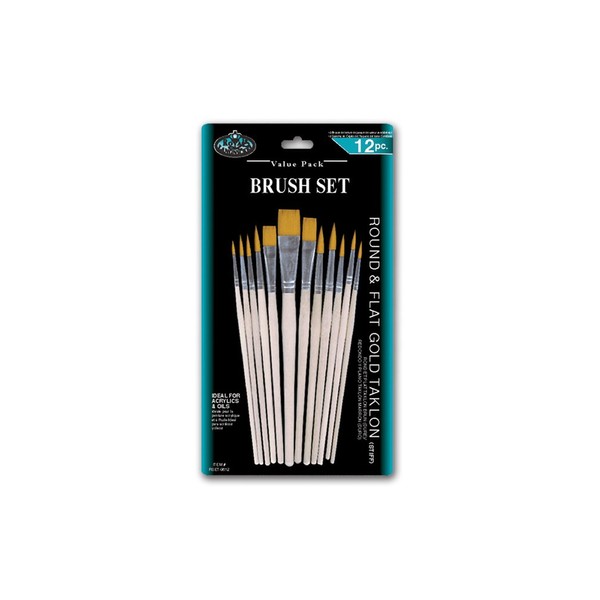 Royal and Langnickel round & flat Gold Taklon variety brush set - Gold. Ideal for acrylics & oil. The set contains: round 1, 2, 3, 4, 5, 6, 7, 8, 9. Flat 3/8 inch, 1/2 inch, 3/4 inch. Pack of 12.