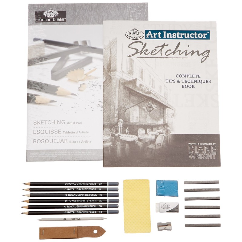 Royal brush-art instructor sketching set. The perfect art set for any artist! 12-1/2x14-3/4x2 inch package contains one artist pad one complete sketching book six graphite pencils six sketching sticks one chamois one sandpaper block one kneaded eraser one drawing eraser one blending stump and one sharpener. Conforms to ASTM D4236. Imported.