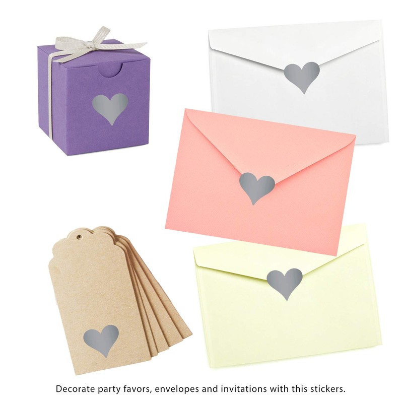- In this package you will receive 600 metallic silver stickers. 40 heart shaped stickers per sheet. 15 sheets total
