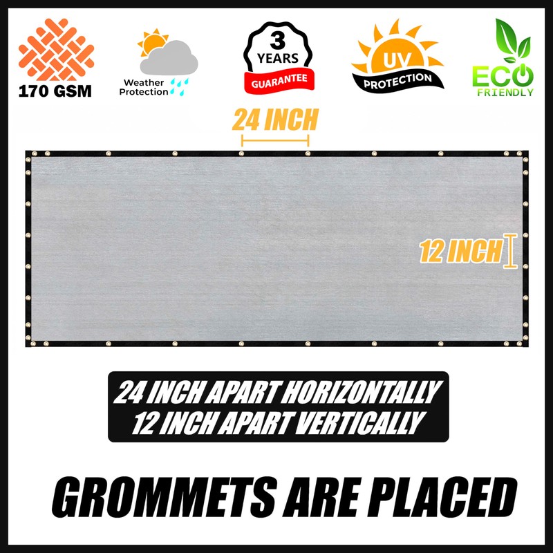 - ⚑ installation: edges are finished with heavy duty black binding and stainless brass Grommets, 4 grommets in each corner, other grommets are placed evenly along the edges, 12" Apart on vertical edges, 24" Apart on horizontal edges.