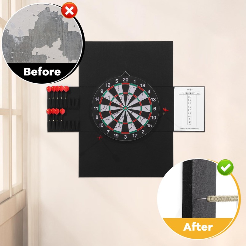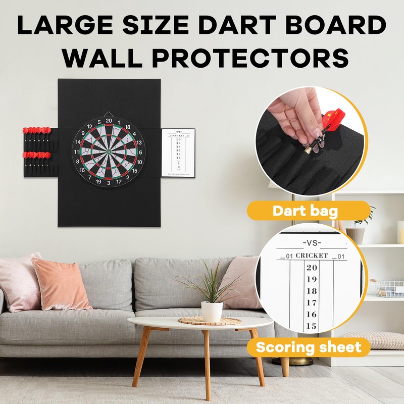 - Complete accessories: Not only does our dart board backing wall protector come with a larger format, we also include a scorer, dart storage and a pen so you can play the perfect dart match and then put it all on the wall to prevent loss.