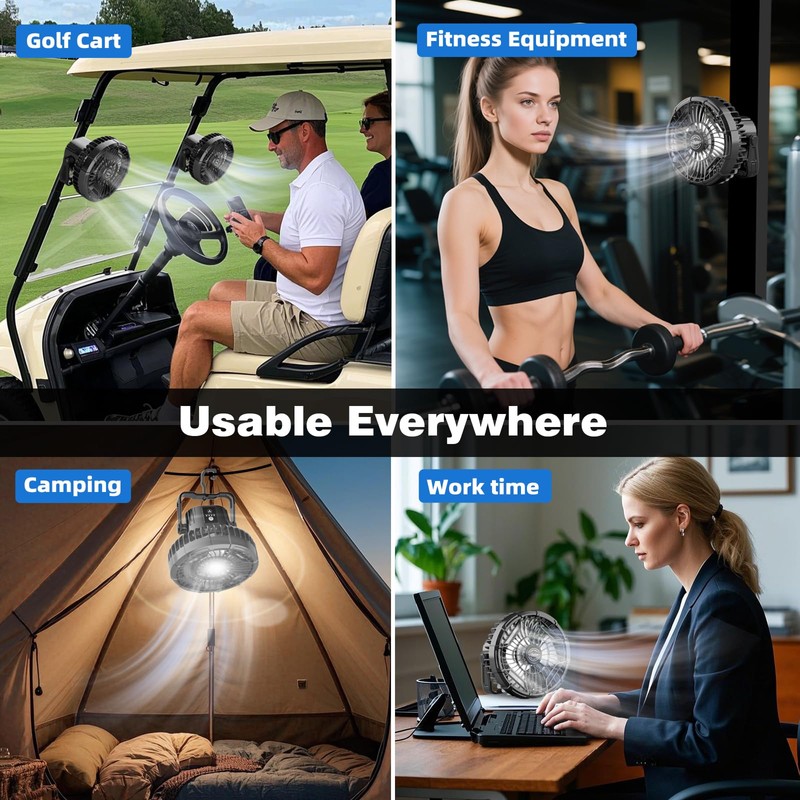 - Ultra-Portable Design: With a handy handle, this golf cart magnetic fan becomes effortless portability. By simply propping up the handle, it can transform into a tabletop fan. Our golf cart fan even can be used as a power bank to charge your phone on the go. (The Type-C port powers the fan, and the USB port charges your phone.)