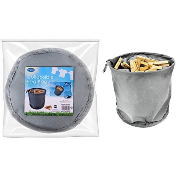 - Collapsible Drawstring Peg Bag With Carabiner clip. This Collapsible Draw String Peg Bag is an essential for every household, featuring an innovative collapsible design which is convenient for storing, a draw string closure and a clip to attahced to a washing line. Material: Polyester Collapsible design 18X18CM Approx