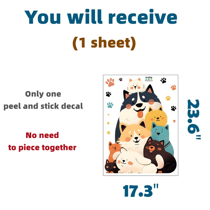 - Size: You will get one sheet of 23.6'' × 17.3'' (60 cm × 44 cm); packaging in roll; finished size of this dogs and cats hugging wall sticker is approximately 18.5'' x 22.4''(47 cm x 57 cm)