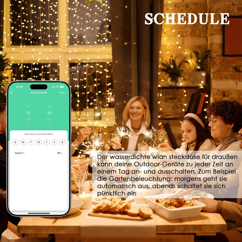 • Zeitplan und Countdown:Sie k?nnen die Schaltzeit in der App voreinstellen, um Au?enbeleuchtung, Bew?sserung und ?hnliche Ger?te automatisch ein- oder auszuschalten und somit Energie zu sparen. Zus?tzlich steht eine Countdown-Funktion zur Verf1gung, beispielsweise zur automatischen Abschaltung nach sechs Stunden.