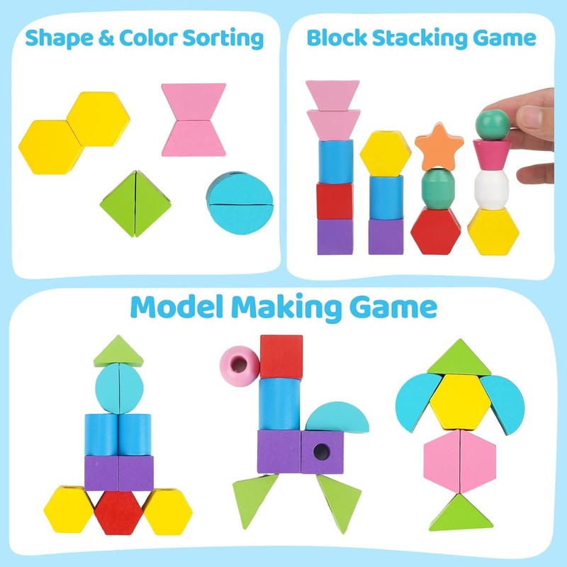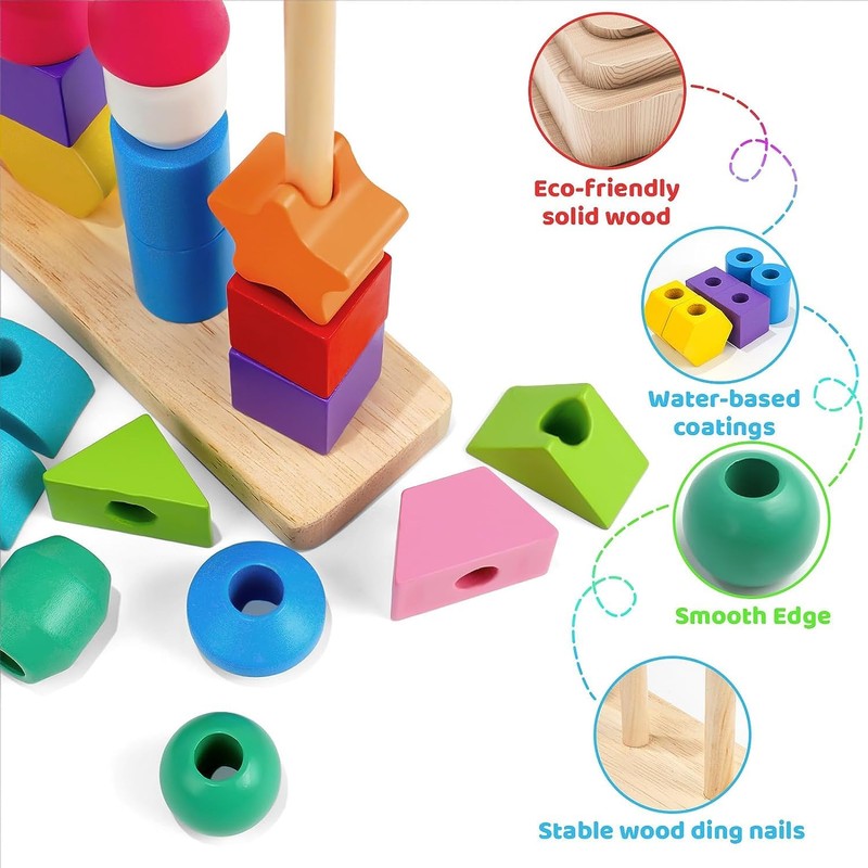 - Early educational puzzle toy: perfect stacking toy and autism toy for boys and girls. Children can use them for stacking blocks, threading beads, sequencing blocks, lacing, colour matching, sorting, shape recognition, counting or making beautiful wooden chains and bracelets. The stacking game is a better way to stimulate baby's imagination and creativity, and develop their hand-eye coordination, fine motor skills and visual spatial skills.