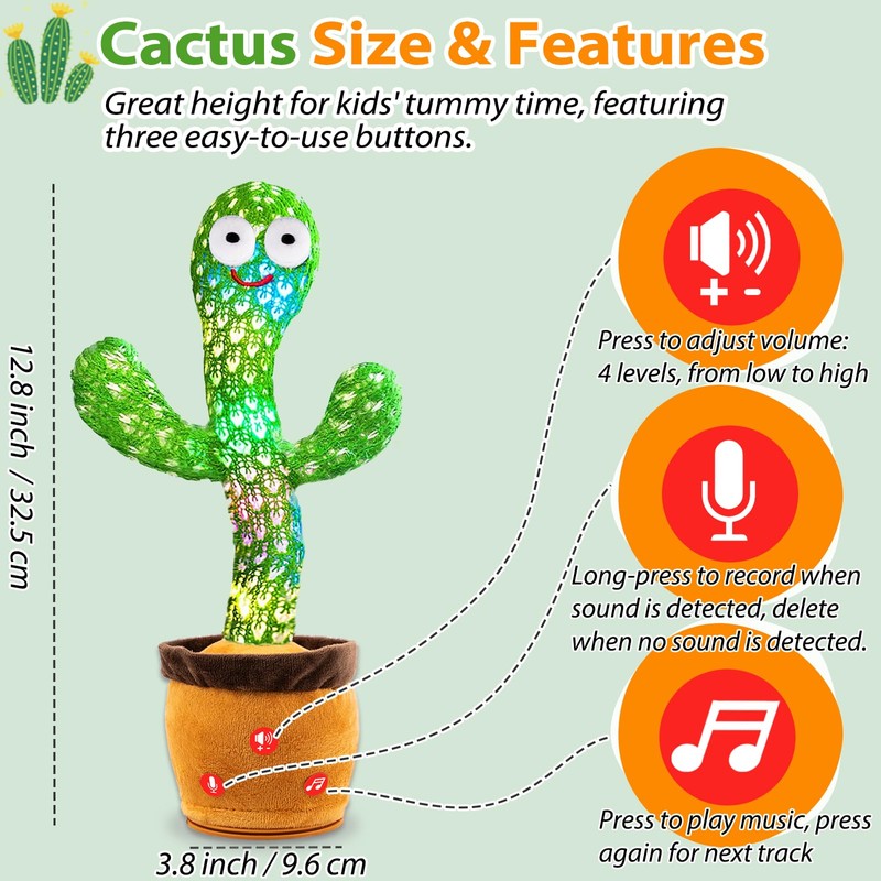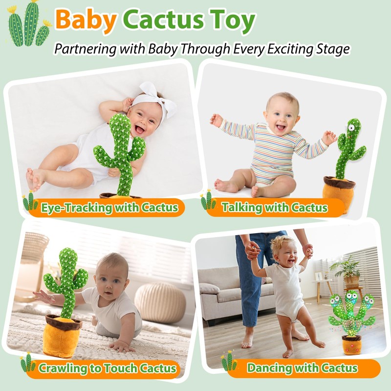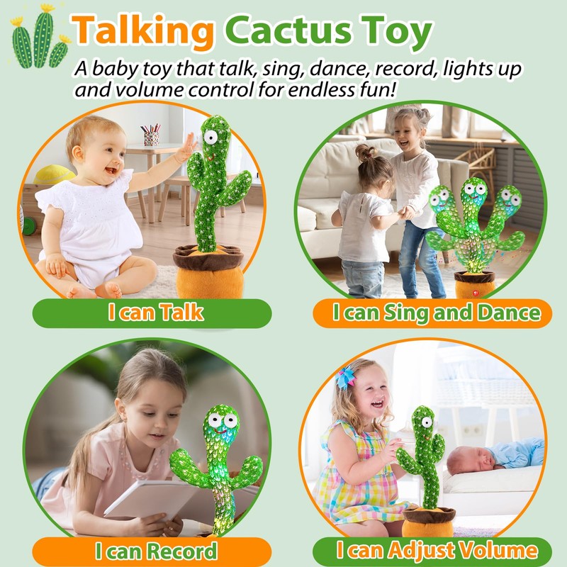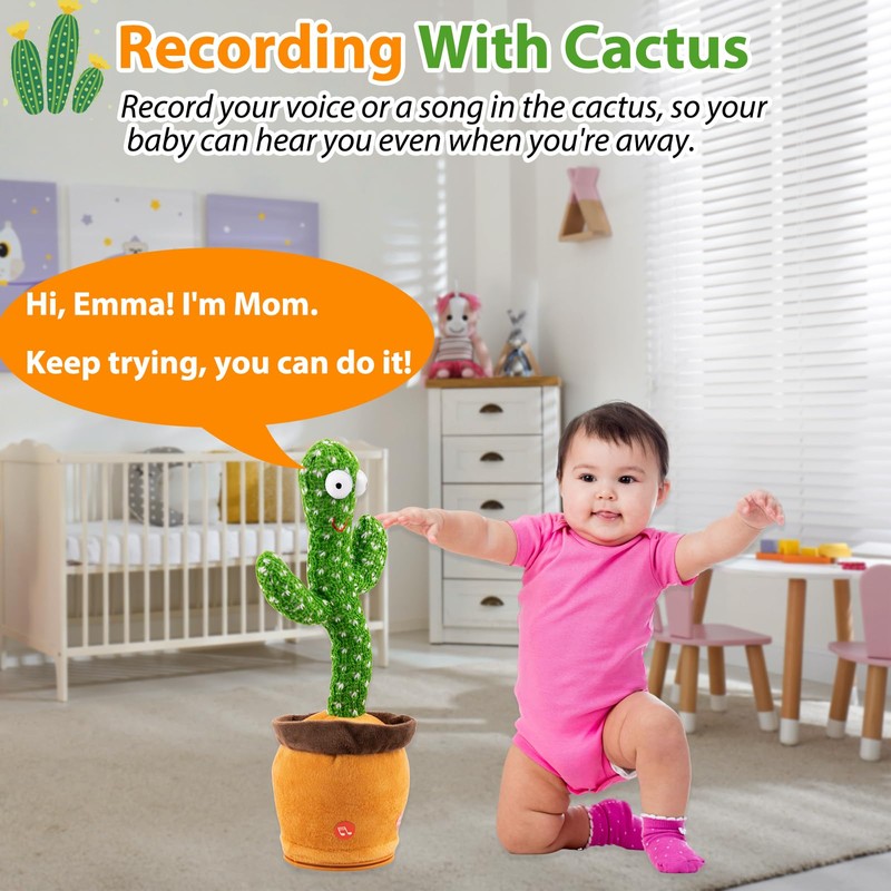 - An Ideal Gift for Kids Babies and Toddlers. —— The talking cactus toy is a companion for every childhood stage, a gift that never disappoints. Enhancing interaction, fostering child development, and cactus unique appearance make it a special surprise for kids. Perfect gift idea for Baby Shower, Birthday, Children's Day, Christmas, Valentine's Day, Easter.