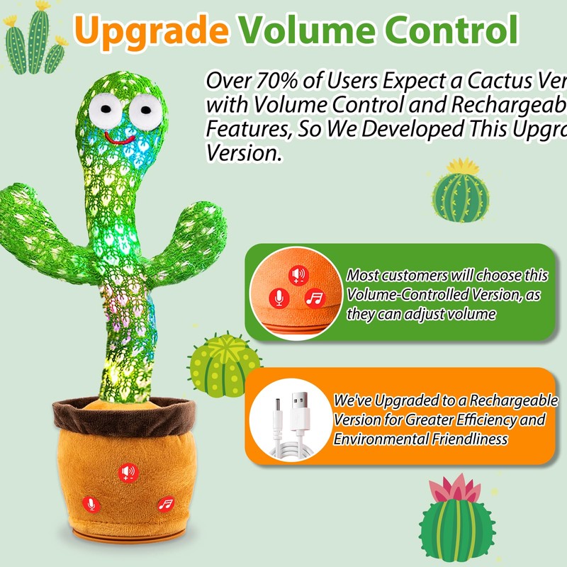 - What Features of Talking Cactus Toy? —— This talking cactus toy repeats what we say, sparking a strong desire in babies to express themselves. Cactus baby toy also sings, dances, and lights up. Babies are fascinated watching this silly cactus toy sing and dance, never getting tired of cactus. This mimicking cactus toy can also record our voices, allowing us to comfort babies with our voices even when we're away.