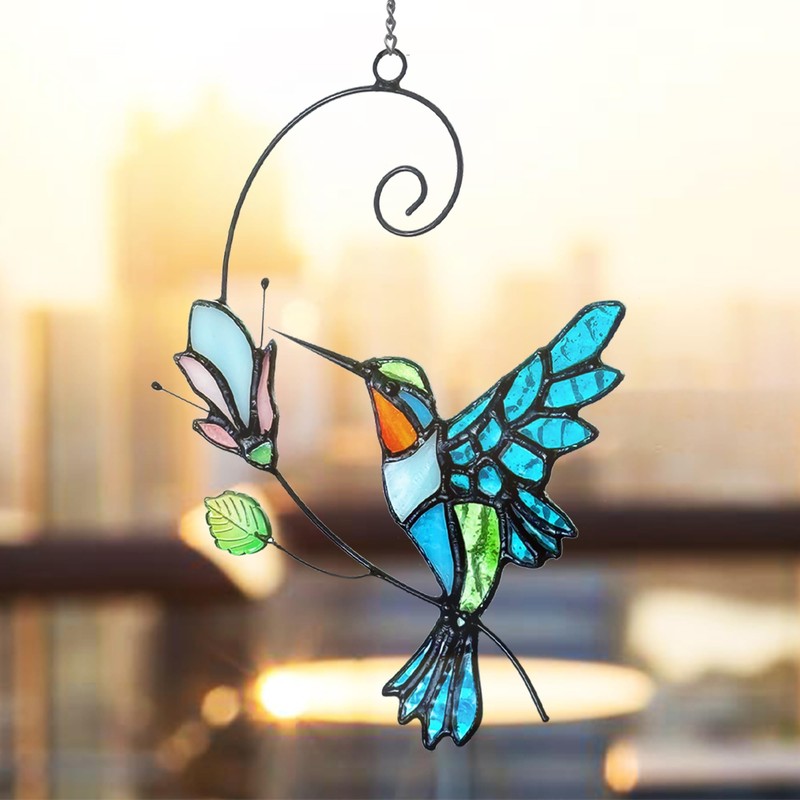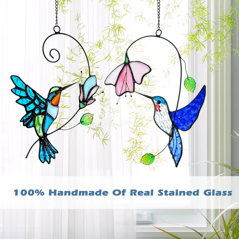 Royxen 2 Pack Hummingbird Stained Glass Window Hangings Handmade Bird Sun Catcher for Home Window