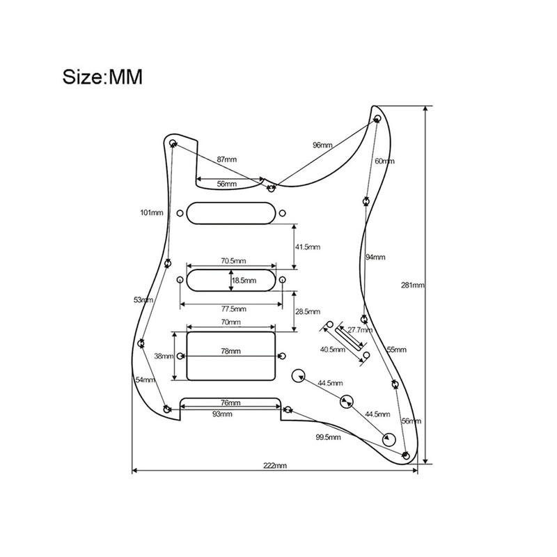- 11 screw holes in the side of pickguard, 3 pickup holes (single coil - single coil - humbucker) were cut to fit American/Mexican Standard Fender Stratocaster.Back plate is as pictures shown.