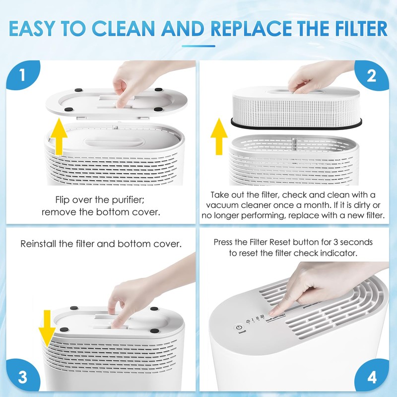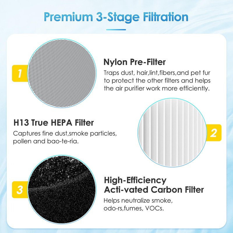 - 【Premium 3-Stage Filtration】①High-Efficiency Activated Carbon Filter absorbs cooking smells,smoke,and pet odors. ②H13 True HEPA Filter absorbs pet dander, dust, smoke, pollen, and other particles. ③Nylon Pre-Filter obstructs large particles such as dust, hair, lint, fibers and pet fur to help the air purifier work more efficiently