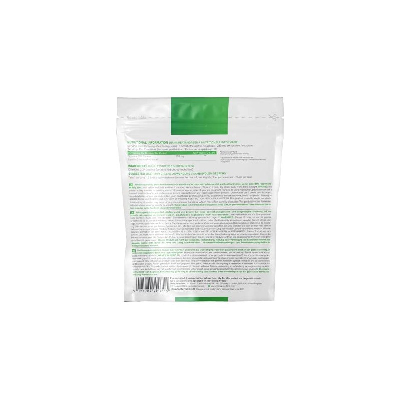 - No fillers or binders – each bag contains 25 g of citicolin. Each daily serving consisting of a measuring spoon provides 250 mg. We haven't added anything to this dietary supplement - just citocolin powder.