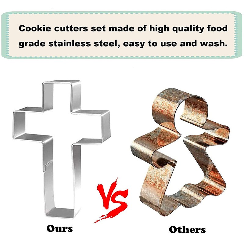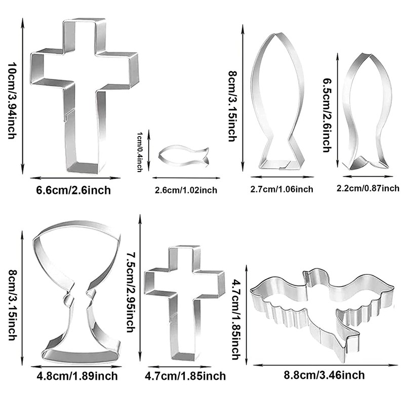 - Cookie cutter set. The set contains a total of 7 cookie cutters, including 1 large cookie cutters, 1 medium cookie cutter, 1 small cookie cutter, 1 large cross, 1 small cross, 1 dove, 1 holy grail.