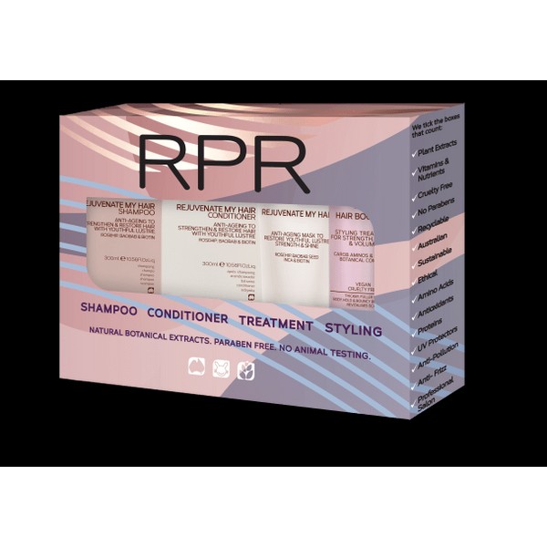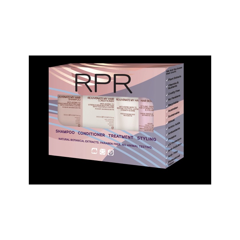 The RPR Rejuvenate My Hair Quad Pack is an anti-ageing haircare range that strengthens and restores hair with youthful lustre.