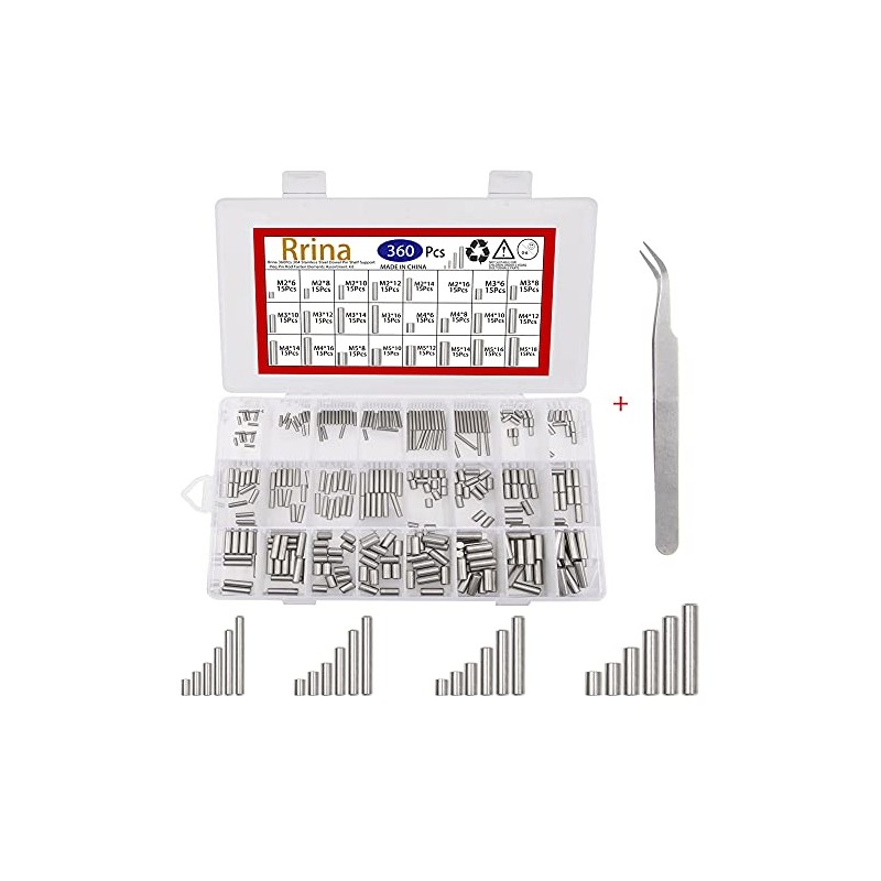 - PACKING QUANTITY: 360Pcs dowel pin 24 Sizes:M2(6/8/10/12/16mm), M3(6/8/10/12/16mm), M4(6/8/10/12/16mm), M5(8/10/12/16/18mm), 1Pcs clip.