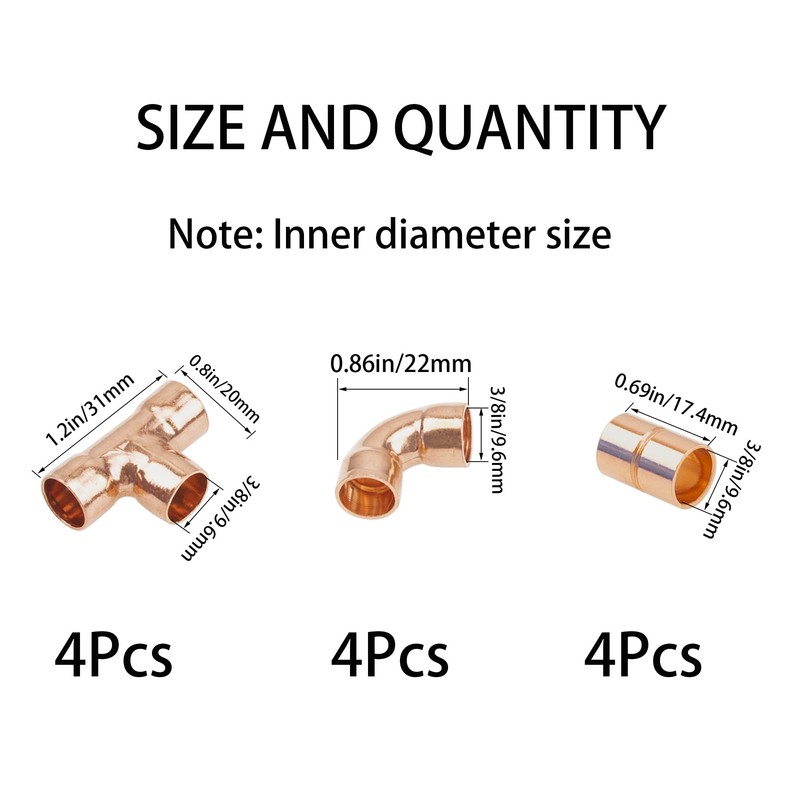 Tamaño: accesorios de tubería ID de conector de 3/8 pulgadas, para uso con tubo de cobre con un diámetro exterior de 3/8 pulgadas.