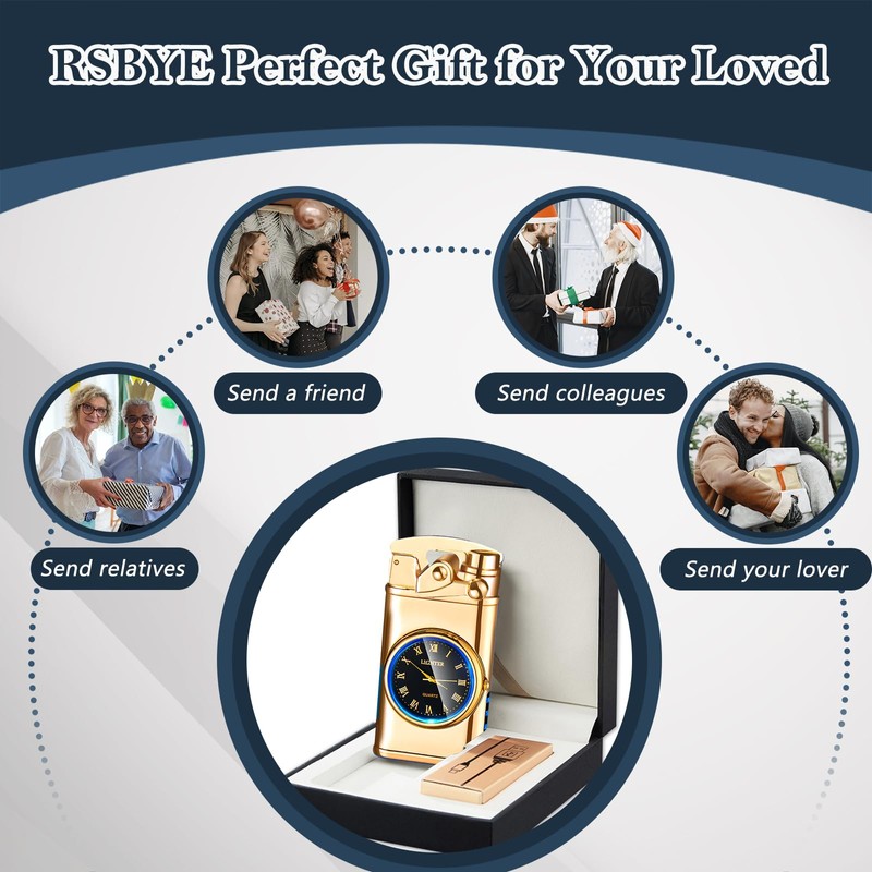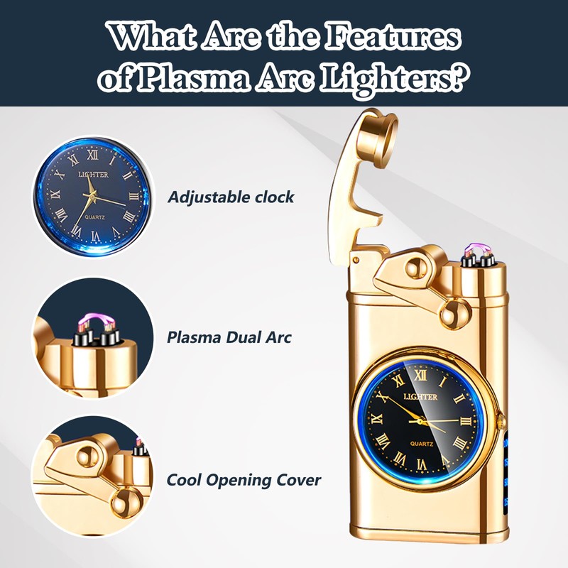 RSBYE Electric Lighter USB Rechargeable Lighters, Windproof Dual Arc Plasma Lighter, Flameless Electronic Cool Lighters with LED Battery Indication for Men (Gold Clock)