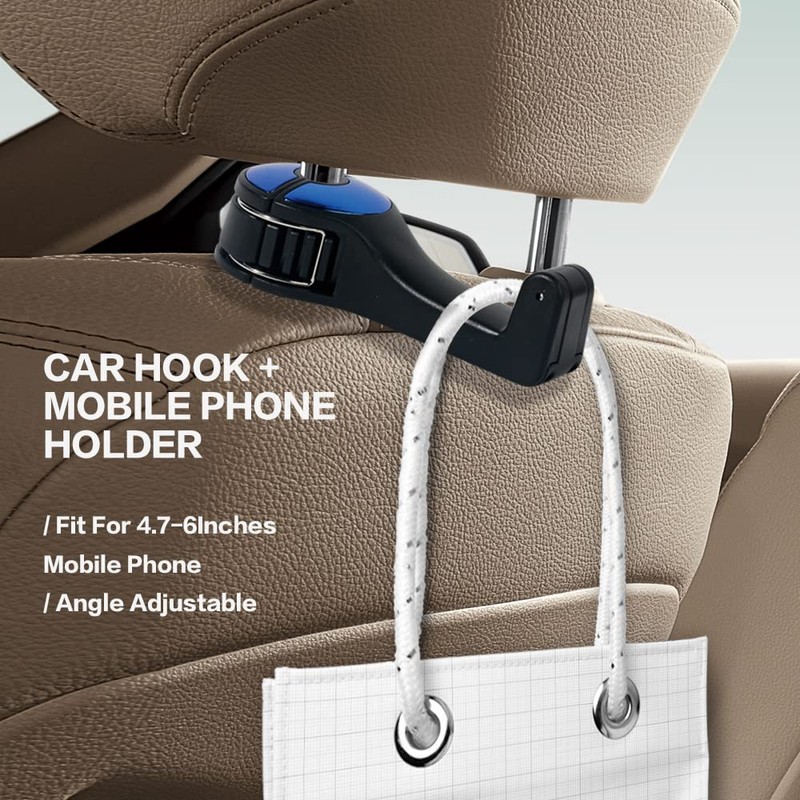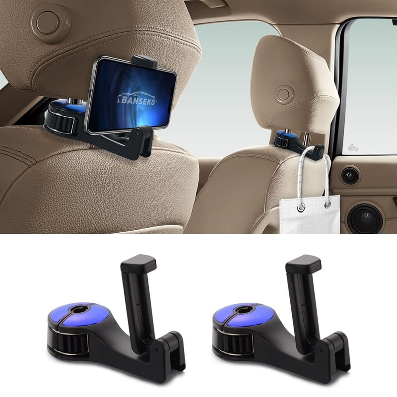 Rsept 2 Pack Car Hook,2 in 1 adjustable Car Seat Hooks Multi-Function with Phone Holder,360° Rotation Headrest Hooks Car Seat Storage Organizer,Car Back Seat Headrest Hanger Holder Hook (Blue)