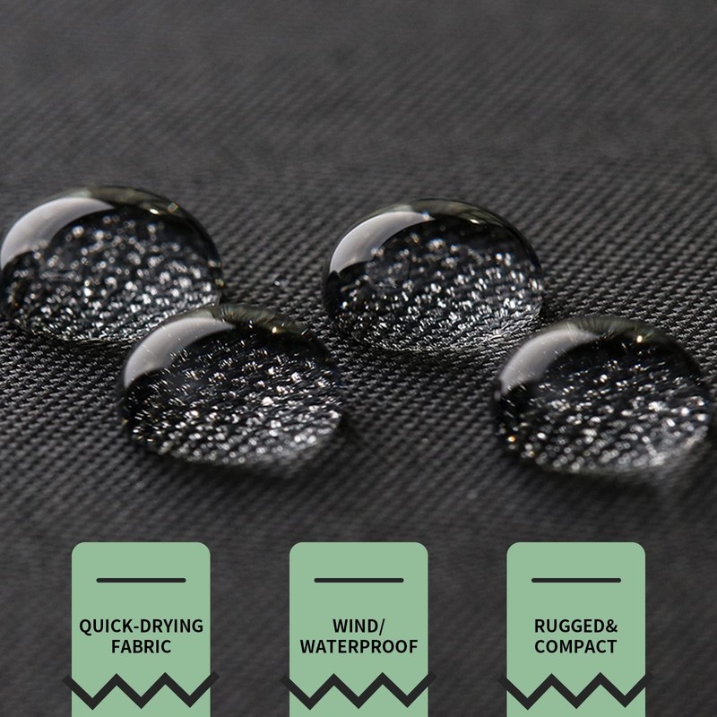 - Waterproof material: the base layer has a waterproof coating with high density, the wetting angle is more than 90°, the umbrella cloth is hydrophobic and the outer layer has a super water-repellent coating and a large amount of fluorine-containing active ingredient effectively prevents water droplets from entering the fibre. Excellent fabric that dries quickly and is mildew resistant