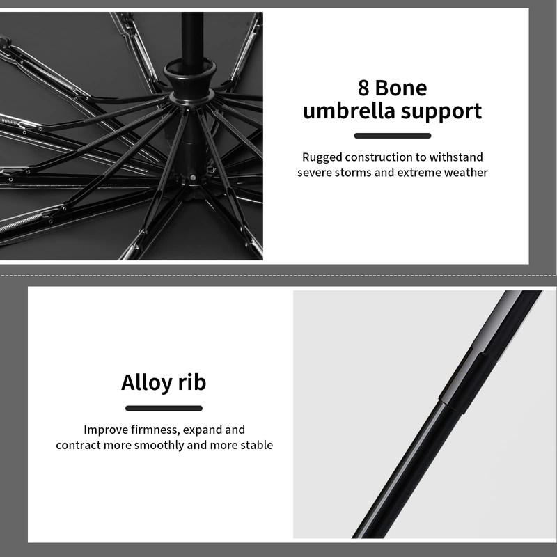 - Robust and windproof: with a steel frame umbrella frame, the steel frame is robust and the colour does not rust, 8 folds strengthen the metal rib support, integrate lightweight, strong flexibility and high-strength thick spring (tested to be able to open and close 500 times trouble-free opening), strong and durable, extremely windproof