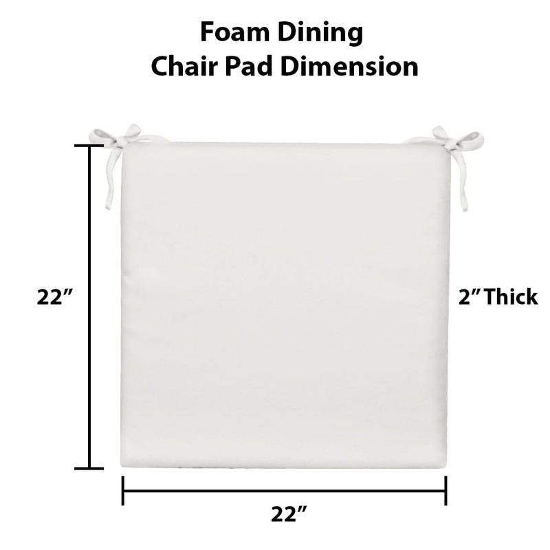 - SIZE SPECIFICATIONS – These square foam seat cushions measure 22” x 22" seam to seam with 2" thick foam inserts. Note: cushions may not fit properly in rectangular or rounded seating.