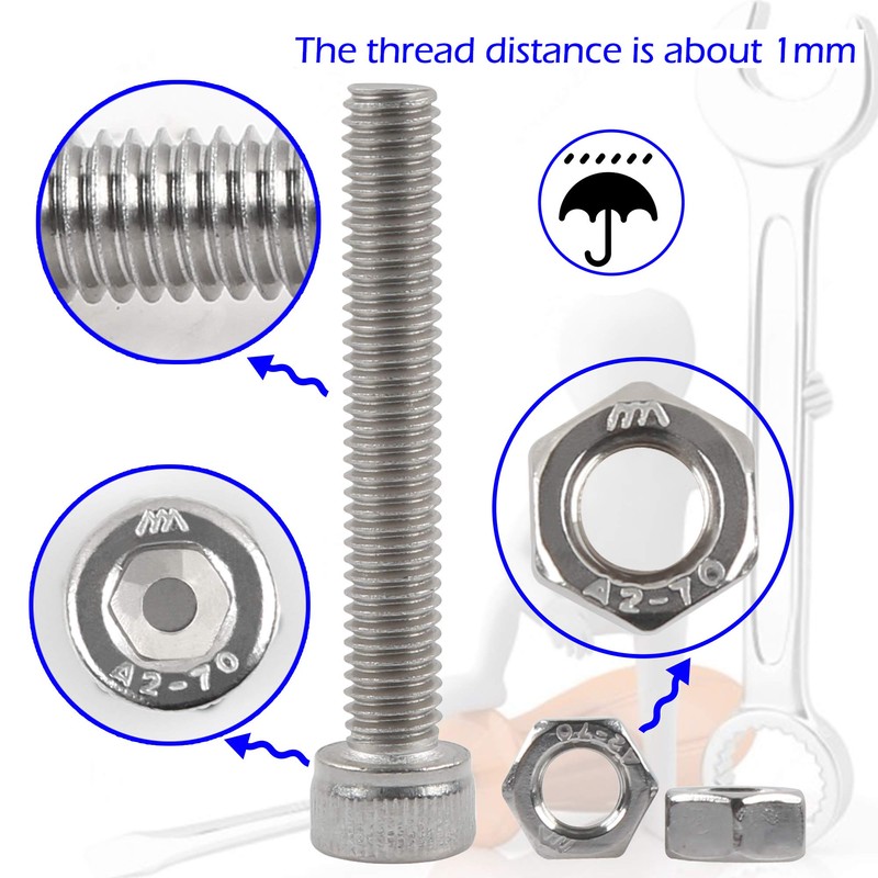 - 🔧【High-quality material】 Hexagon socket bolts and nuts are made of 304 stainless steel, which has high hardness, oxidation resistance and durability. Hexagon socket bolts are anti-rust, anti-corrosion and wear resistance.Stainless steel nuts and bolts can work well in humid environment