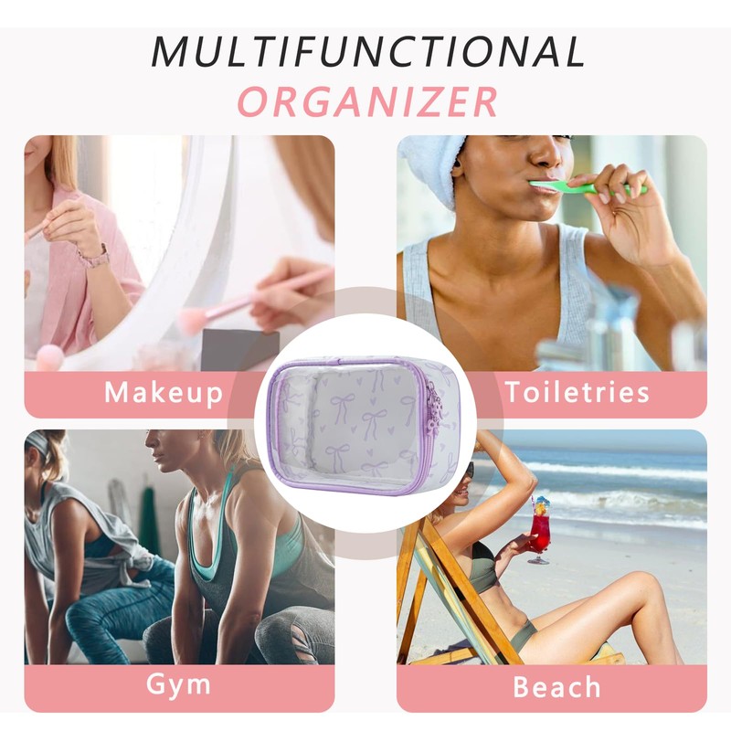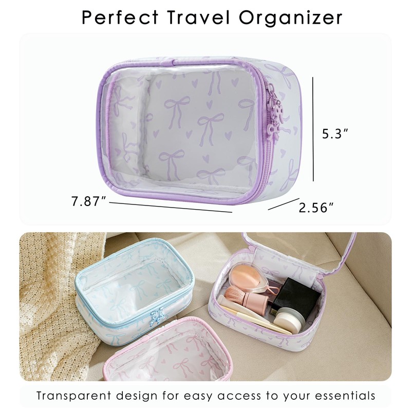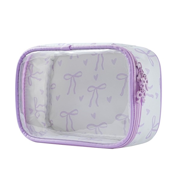 RSRSLEII Cute Clear Makeup Bag with Bow Pattern,Transparent Nylon Travel Cosmetic Case with Zipper,Portable Makeup Organizer Pouch for Essentials(03Purple)