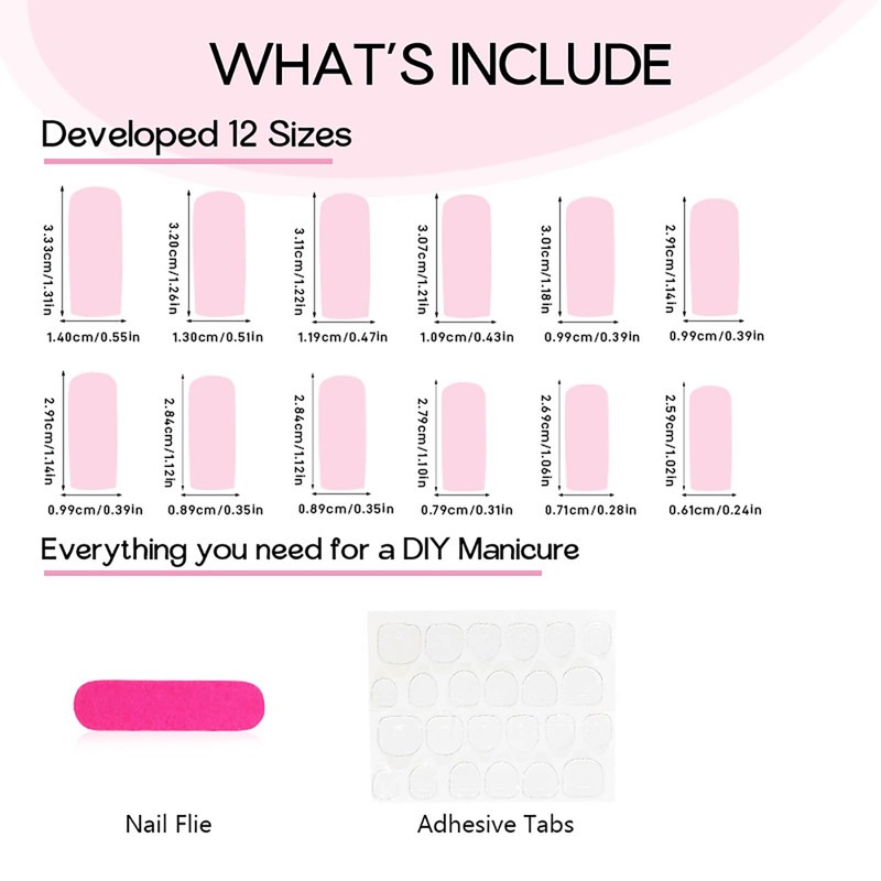 24 artificial nails(12 sizes), 24 jelly glue stickers.1 mini nail file.1 alcohol cotton.1 Manicure Stick.