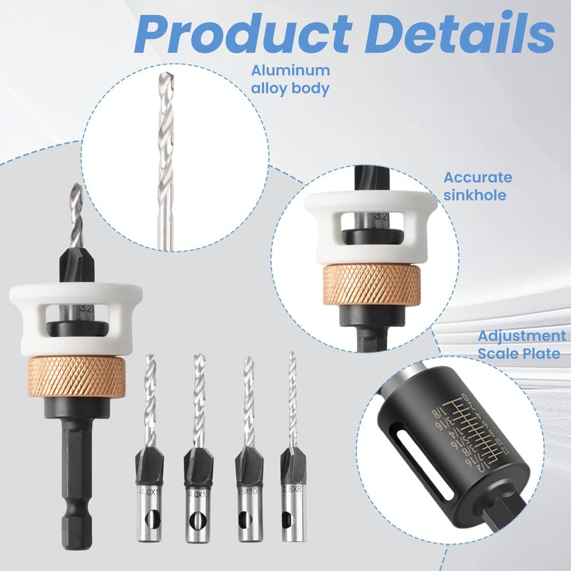 • Adjustable depth drill countersink set: the drill countersink comes with depth stops that do not penetrate and thus improve work efficiency. The adjustable countersink length with a cross reference scale value, which allows the drill length to be optimally adapted to screws of different lengths. Pre-drilling and countersinking in one step, increased smooth depth control ring effectively reduces surface damage.
