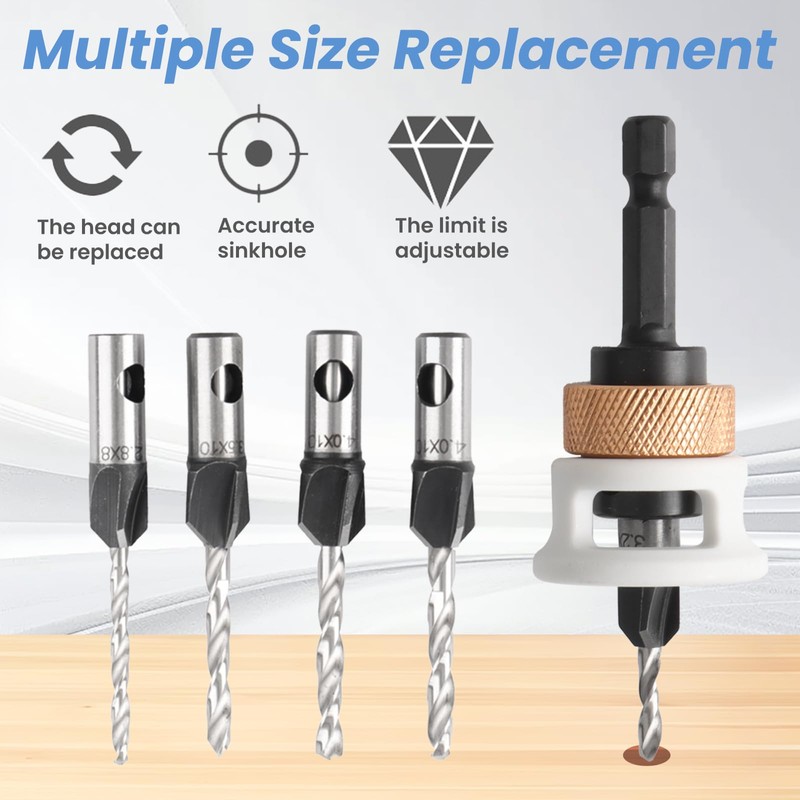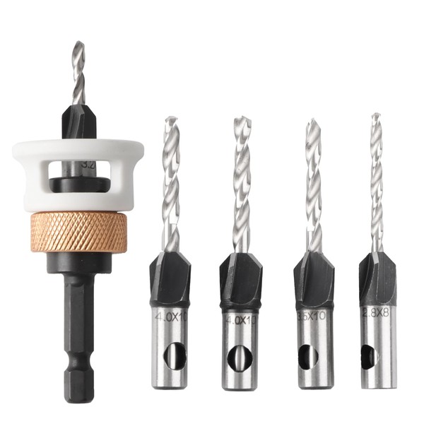• The 6-piece countersink metal set: includes 4 different sizes: 2.8 x 8 mm, 3.2 x 8 mm, 3.5 x 10 mm, 4 x 10 mm (all with 3/8 inch 82° countersunk holes and 1/4 inch hex shanks) and a hex key. The drill can be quickly replaced if necessary, easy to use.