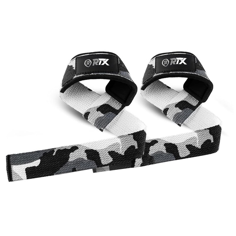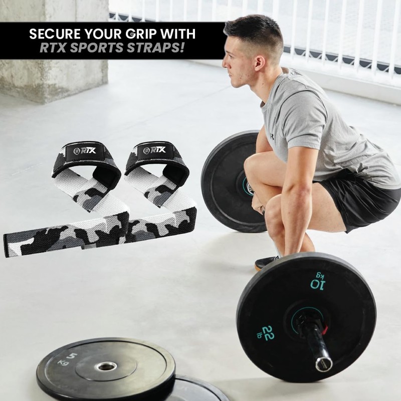 RTX Unisex Lifting Straps Strength Training Bodybuilding - Gym Deadlift Straps with Neoprene Padded Wrist, Non-Slip Grip for Weightlifting (Camo Grey)