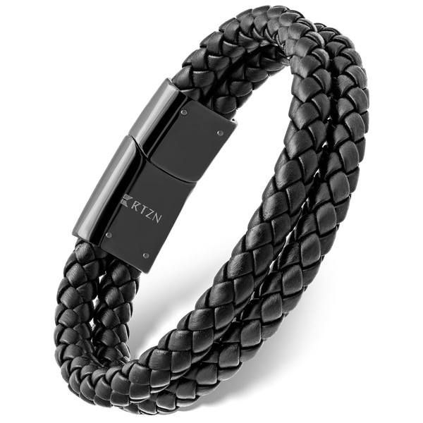 RTZN® Black Leather Bracelet for Men – Premium Artisan Handcrafted Double Strand Black Braided Leather Bracelet – Authentic Stacked Black Mens Leather Bracelet (Medium)