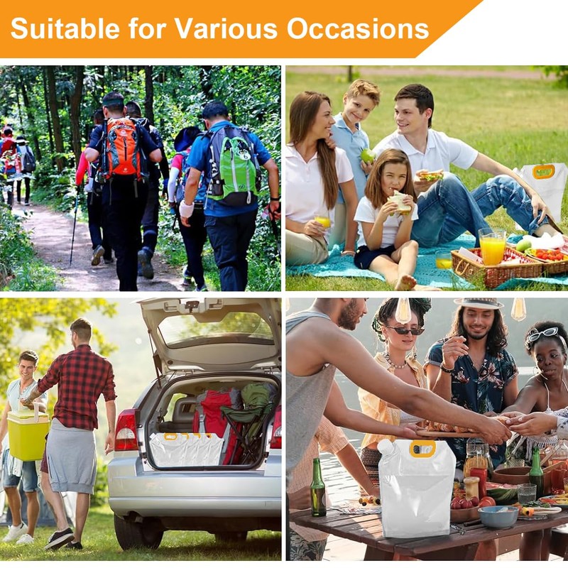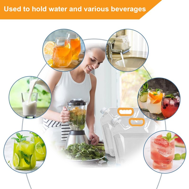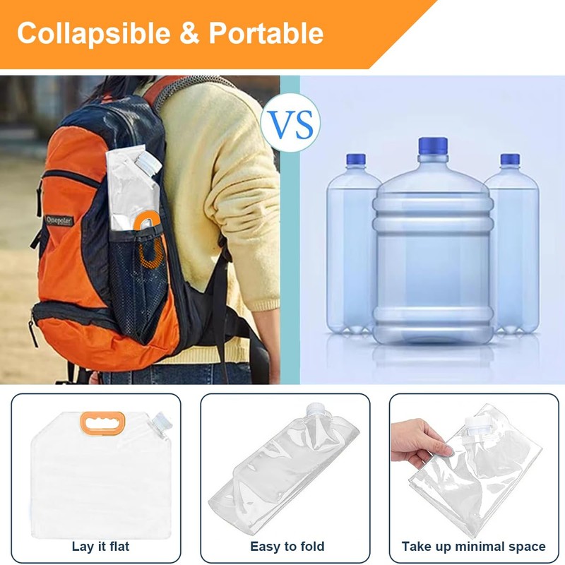 - 💦 100% SAFE FOOD SAFE: The foldable drinking water containers are made of food grade plastic, non-toxic, contain no bisphenol A and have no unpleasant smell. They can be used for storing drinking water, beer, drinks, juices and other foods.