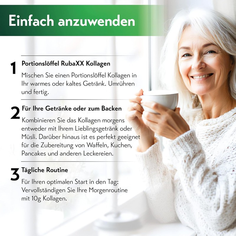 MORE PRODUCT INFORMATION Collagen is far more than just a simple protein in our body, it forms the framework for different types of tissues, including the joints. In terms of our joints, collagen plays a crucial role in building cartilage tissue, which acts as a shock absorber between the bones, protecting the joints from friction and wear. In addition, collagen fibers are an important component of tendons and ligaments that stabilise the joints while allowing flexible movements. With age, the body's own collagen production naturally decreases - a process that can be further accelerated by excessive stress or an unhealthy lifestyle. The result may be a collagen deficiency that affects the health of the joints and connective tissue. RubaXX collagen was developed by the joint specialists of the RubaXX® brand, which stands for the highest expertise in muscle and joint health in pharmacy quality. *Vitamin C contributes to normal collagen formation for normal functioning of blood vessels, skin, bones and cartilage, zinc contributes to the maintenance of normal bones, vitamin D contributes to the maintenance of normal muscle function, copper contributes to the maintenance of normal connective tissue. Suggested dose/instructions for use: daily stir one serving spoon (= 10 g) into water, tea, coffee, smoothies or soups. Do not exceed the recommended daily dose. Ingredients: 99.8% Sologell™ collagen hydrolysate (beef), L-ascorbic acid, zinc picolinate, copper gluconate, cholecalciferol, D-biotin.