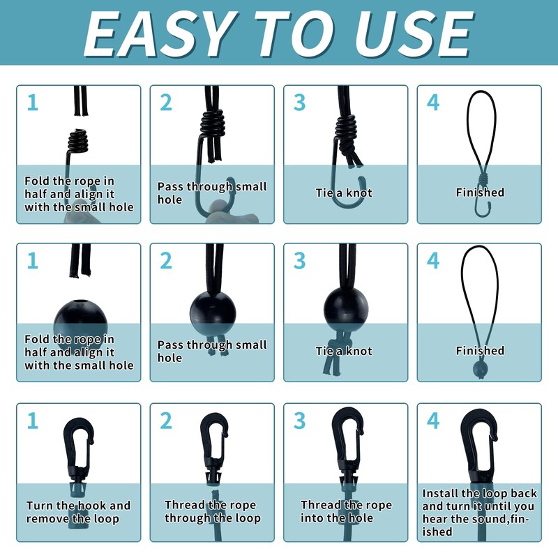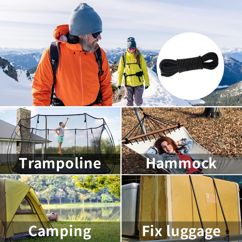 - Wide application: bungee cord can be used indoors and outdoors. It can be used for tents, tarpaulins, camping, posters, canopies, awnings, advertising banners, swimming pool tarpaulins, tarpaulin attachments, sailing boat, trailers, advertising tarpaulins, etc. Perfect for DIY kayaks, hiking bags, hammocks and more