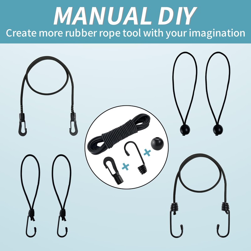 - Elastic expander rope set: you can get 10 m black stretch rope (diameter 4 mm), 10 x spiral hooks, 10 x plastic hooks/car lock hooks and 10 x ball