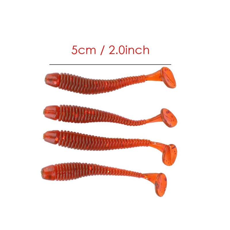 Rubber Fish, 50 Pieces Soft Fishing Lure Bait Set, 5 cm Plastic Fishing Bait, T-Tail Grub Worm Bait, Fish Harness Accessories, 9 Colours (Red)