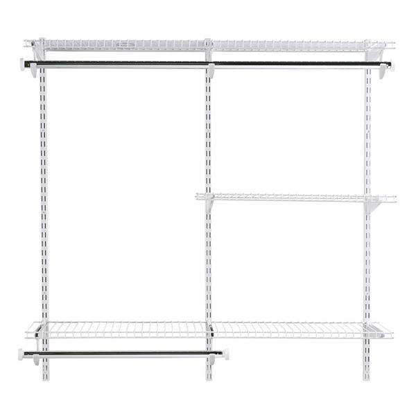 - Telescoping rods and expanding shelves adjust to add 12 ft. of shelving space and 10 ft. of hanging space
