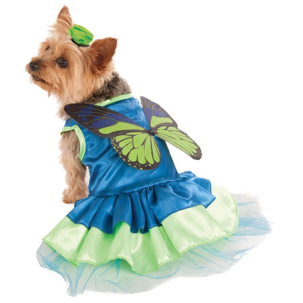 Pixie/fairy pet costume includes frilly dress with attached wings and matching headpiece in green and blue. IMPORTANT! NOT ALL COSTUMES WILL FIT ALL PETS, consider costume style and animal size; READ THE RUBIE’S PET SIZE CHART and WATCH THE SIZING INSTRUCTION VIDEO, do not select size based on breed. Family- owned, family-focused, and based in the U.S.A. since 1950, Rubie’s is the world’s largest designer and manufacturer of costumes – of course they’d remember your four-legged best friend!