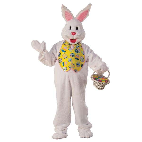- Deluxe Mascot quality Bunny costume features large, plush body with vibrant yellow vest and matching bow-tie